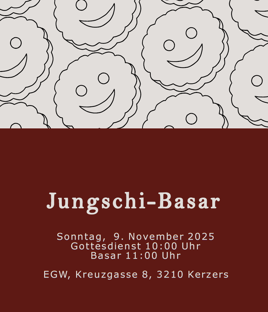 Wir starten um 10:00 Uhr im EGW in Kerzers, an der Kreuzgasse 8, mit einem Gottesdienst und freuen uns anschliessend, mit den Gästen den Basar zu eröffnen. Gerne präsentieren wir hierbei Backwaren vom vortägigen Jungschar-Nachmittag sowie selbstgebastelte Ware der Kinder. Mit den Einnahmen dieser Verkaufsprodukte finanzieren wir unsere Jungschar-Aktivitäten und unseren Verein.